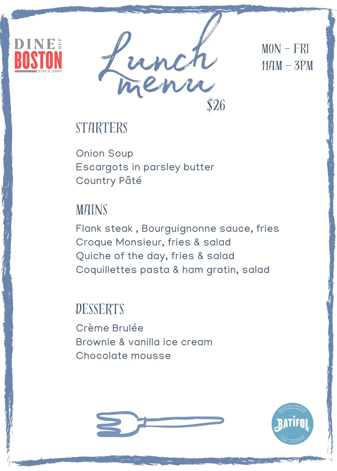 Join us for a special prix fixe menu celebrating French-inspired cuisine, available for lunch Monday through Friday and for dinner Monday through Sunday. A perfect occasion to experience Batifol during Boston’s most anticipated dining event.