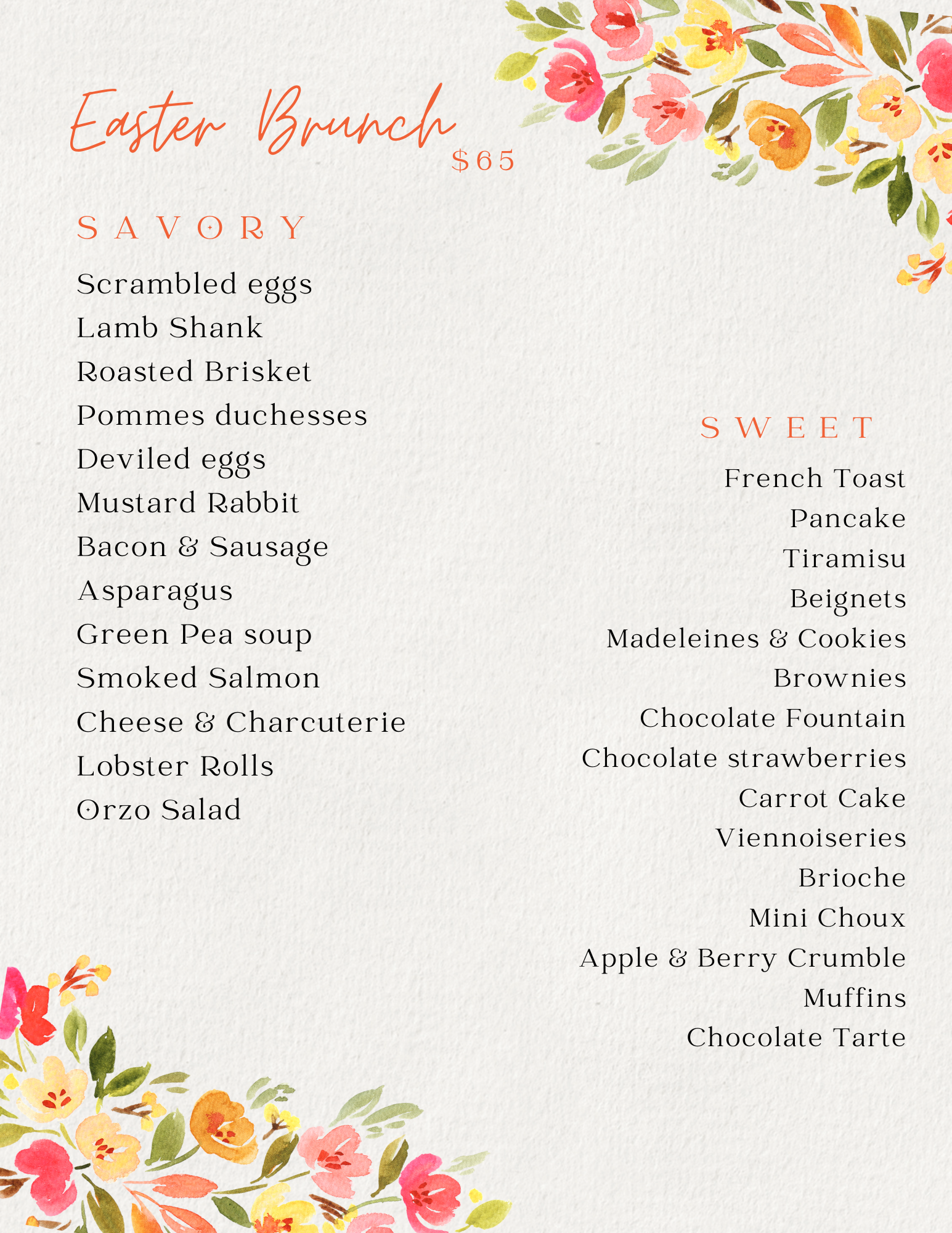 On Easter Sunday (10 AM–3 PM), we will instead serve a special $65 Easter brunch menu, created especially for the occasion to celebrate the holiday with a festive touch. 🌸🥐